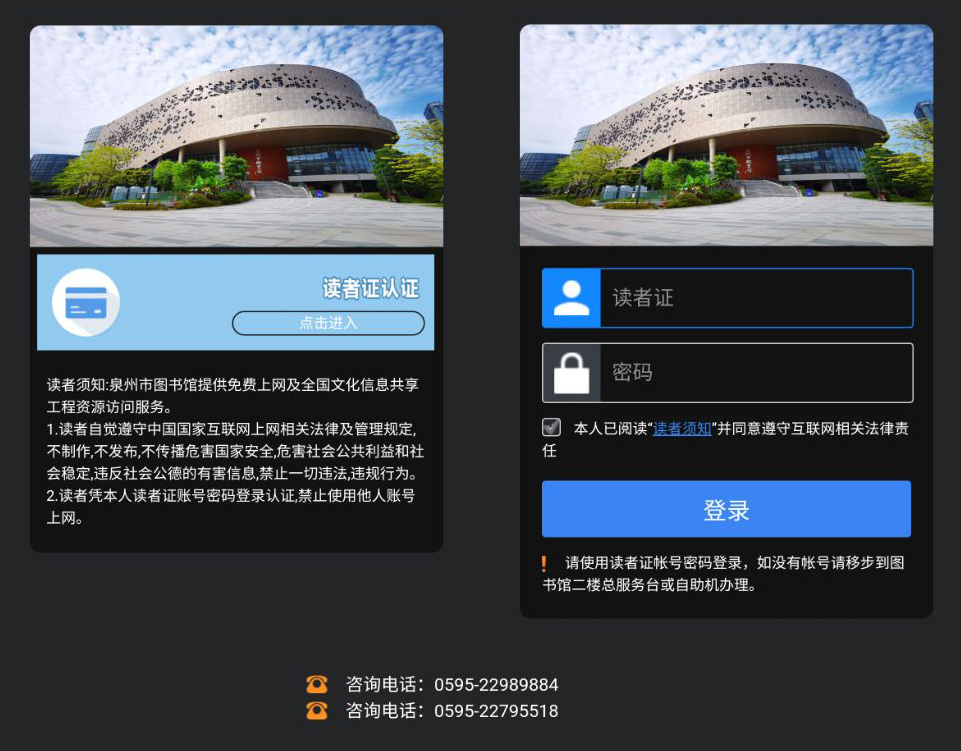 泉州市图书馆东海中心馆无线网络域名:qzstsg_guest;在验证页面内,请使用读者证号和密码(默认生日八位数例:19901010)验证上网。如需连接WiFi未办理读者证者,请到2楼大厅服务台实名登记方可免费连接。
