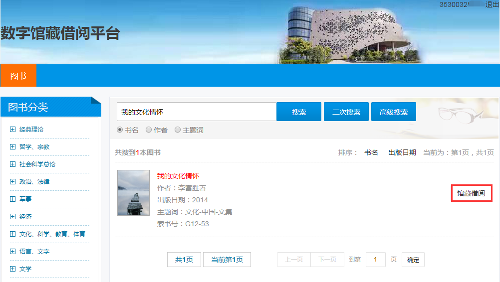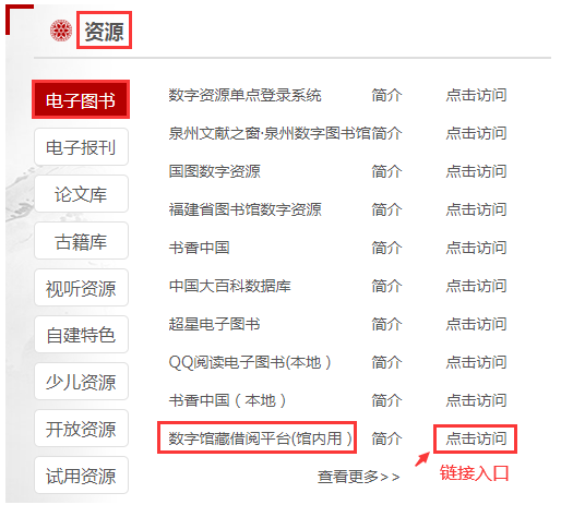 路径:官网首页—>资源—>电子图书—>数字馆藏借阅平台(馆内用)(如图1)
