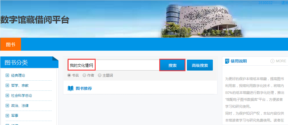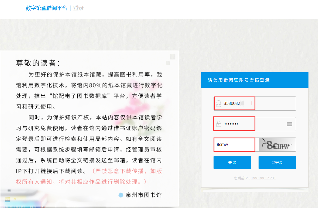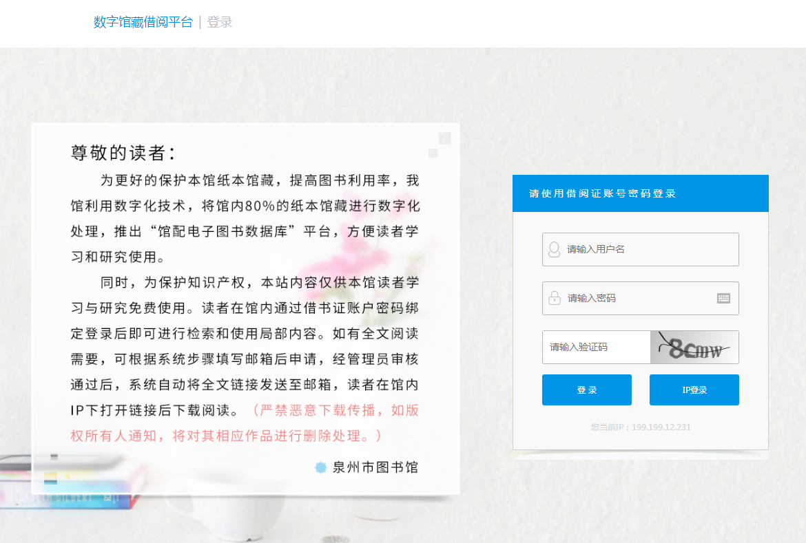 为更好地保护本馆纸本馆藏,提高图书利用率,我馆利用数字化技术,将馆内部分纸本馆藏进行数字化处理,推出泉州市图书馆“数字馆藏借阅平台”,方便读者学习和研究使用。同时,为保护知识产权,本站内容仅供本馆读者学习与研究免费使用。读者在馆内(东海中心馆、少儿分馆)IP内访问平台,通过借书证账户密码绑定登录后即可进行检索和使用。