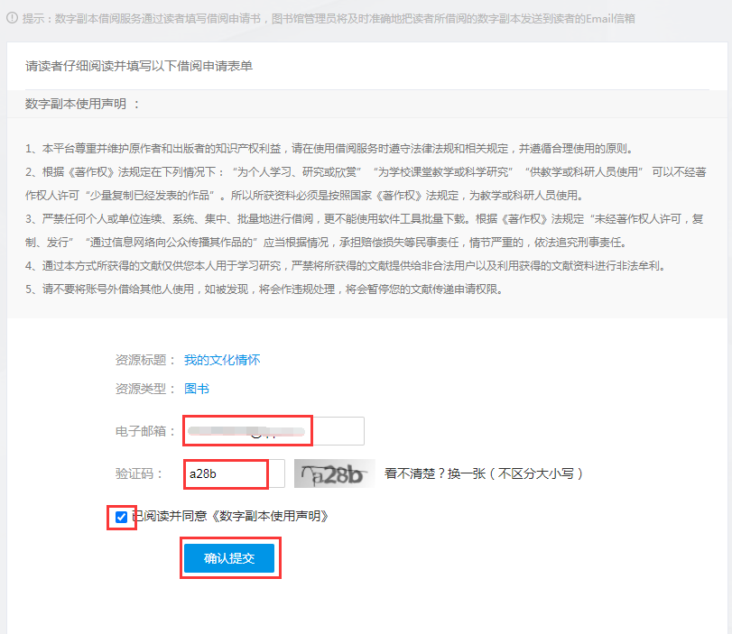 通过点击检索结果页面的“馆藏借阅”按钮(如图10)或预览页面的“借阅”按钮(如图11),进入数字副本借阅申请界面,输入正确的电子邮箱及验证码,点击确认提交,即可申请借阅馆藏纸质图书电子版(图12)。