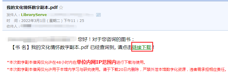 当图书馆工作人员审核通过馆藏电子书的借阅申请后,读者便可收到借阅申请的回复邮件,读者点击邮件内的“链接下载”即下载该书的全文(图13)。